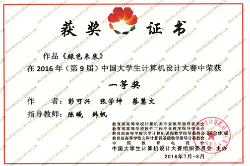 2016年7月30日上午,由中国大学生计算机设计大赛组织委员会主办,教育部高等学校各委员会及中国教育电视台联合组成的第九届中国大学生计算机设计大赛顺利落下帷幕。我院彭可兴、张学坤、蔡慧雯三位同学的作品《绿色未来》夺得了全国一等奖及江苏省特等奖,卜羽、朱佩轶、缪逸尘同学的作品《中华大皮影》获得全国二等奖及省级特等奖,李怡婷、王怿、李小龙同学的作品《绿色世界》获得全国三等奖及省级三等奖,传媒院党委书记韩帆教授及数字媒体艺术系副主任陈曦老师被评为优秀指导教师。