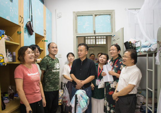随后,老师们走访了新生宿舍。通过深入宿舍,师生关系进一步加强,同学们也倍感温暖,有助于新生早日融入新的环境。老师们对远道而来的新生和家长表示问候,亲切地询问同学们有何困难,逐一解答新生在学习及衣食住行等各方面的疑问,并鼓励同学们尽快适应大学生活,同时提醒新生注意人身、财产安全。新生们表示将谨记叮嘱,在未来的学习中认真努力。