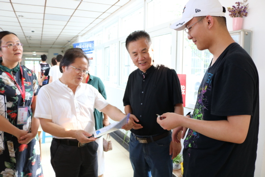 在文园1栋新生报到处,院领导亲自迎接了最后一位报到的,来自新疆、独自来校报到的新生王睿皓楠同学。一路跋涉的王同学到校后由负责迎新的志愿者们接至宿舍,在完成报到程序后,梁院长和许书记亲手将新生材料袋与宿舍钥匙交予王同学,并嘱咐他要在大学期间认真学习,珍惜美好时光,将来交一份完美的成绩单给自己与学院。