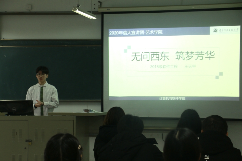 来自计算机软件学院18级的王天宇是国家奖学金和校长奖学金的双料获得者,王天宇同学向大家简单介绍了自己后讲述了他在大学期间参加了互联网加大学生创新创业大赛、两岸青年大学生创业大赛的经历和收获,并提出团队的重要性,以及大学生要学习一些非本专业的知识,拓宽知识层面提高自己的软实力。