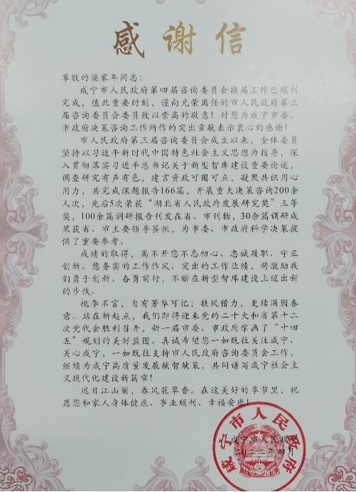 近日,咸宁市人民政府向我院院长梁家年教授发来感谢信,对梁家年教授离任“咸宁市人民政府第三届咨询委员会委员致以崇高的敬意”,对“为咸宁市委、市政府决策咨询工作所作的贡献表示衷心的感谢”。
