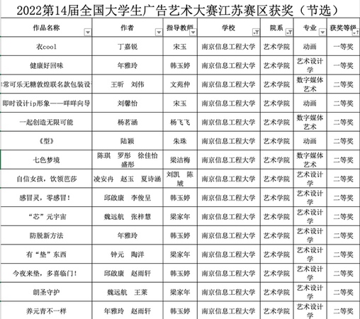 全国大学生广告艺术大赛由教育部高等教育司指导、教育部高等学校新闻传播学类专业教学指导委员会、中国高等教育学会广告教育专业委员会共同主办,纳入大学生竞赛排行榜的学科竞赛本届赛事我院师生喜获佳绩,展示了我院在艺术设计领域对综合性、应用型人才的培养和教学改革的优秀成果,部分获奖名单如图所示。