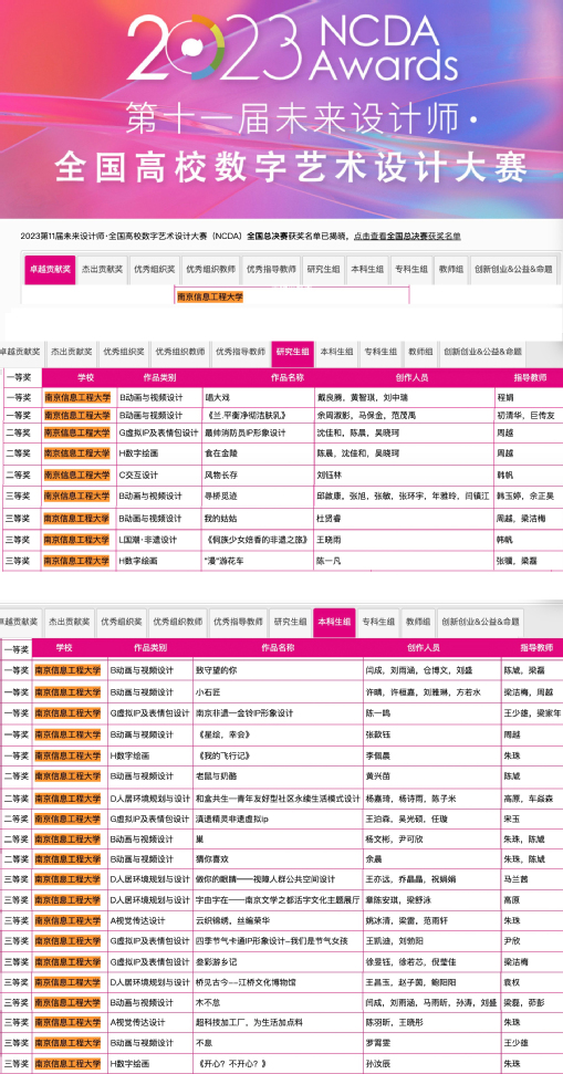 在本次大赛中,学院师生充分发挥了自身专业优势和创意特色,以鲜明的个性和高水平的作品获得了评委和观众的一致好评。其中,获得国赛一等奖的作品《唱大戏》《兰.平衡彻净洁肤乳》《致守望的你》《南京非遗-金铃IP形象设计》《小石匠》《星绘,幸会》《我的飞行记》展现了学生丰富的想象力和技巧,激发了学生的创新思维和创作能力。这是学院教育教学质量和水平的体现,也是学院师生团结协作、勇于创新的结果,希望师生能够继续保持良好的状态,不断追求卓越。