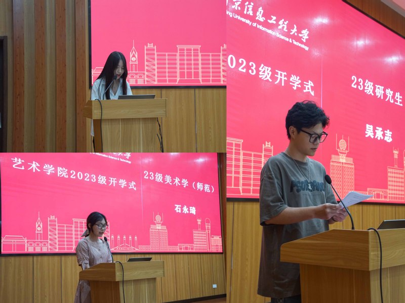 老生代表院青年志愿者协会主席20级数字媒体艺术专业叶婉诺,新生代表23级美术学(师范)专业本科生石永琦、23级艺术设计方向硕士研究生吴承志四位学生代表依次发言,表达出365英国上市公司学子忠于祖国、忠于人民、立鸿鹄志、存报国心、做奋斗者的心声。最后,23级艺术与科技专业的贺晓文带领同学们做入学遵纪宣誓。