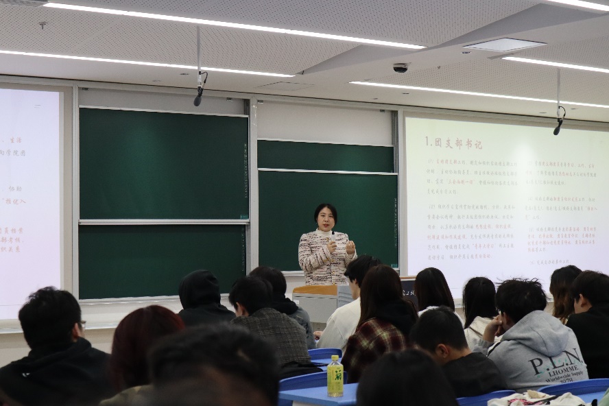 会议最后,关颖婧向大家讲述如何成为一名优秀学生干部。关颖婧认为,优秀学生干部需要保持公心和私心,公心需要大家在工作岗位甘于奉献,私心需要大家在工作中逐步锻炼和提升自己。大学是一种历练,大学里获得的职位是一种荣誉,一种责任,同时也是一种成长。会议最后,关颖婧向大家提出了三点希望:坚守初心、尽职尽责、主动作为。