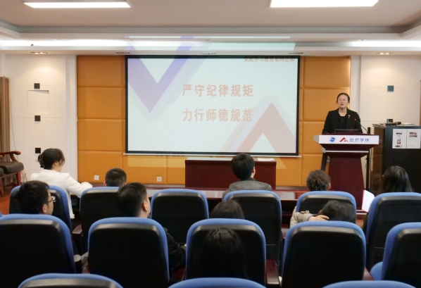 为进一步强化党员纪律意识,特别是加强高校党员教师的师德师风建设,确保始终做到忠诚干净担当。4月19日,我院于逸夫楼s427举行党纪学习教育,我院党委书记詹筱茹主讲题为“严守纪律规矩 力行师德规范”党课,全体教工党员参加。