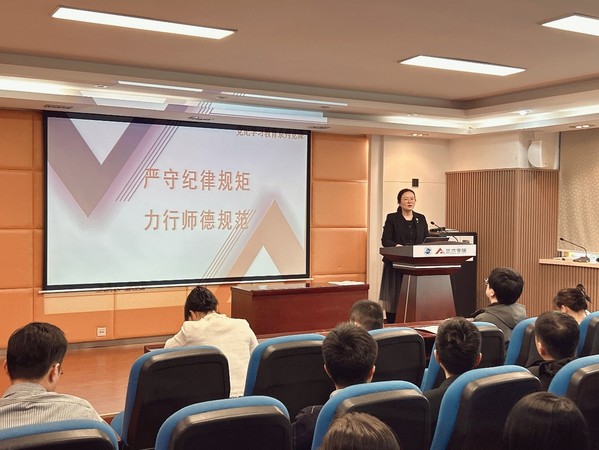 随后詹筱茹分享了在新一轮本科教育教学审核评估背景下对于师德师风的具体要求,从爱国守法、敬业爱生、教书育人、严谨治学、服务社会、为人师表六个方面详细解读了教师基本职业道德规范,结合近期热点案例向老师们传达了《师德负面清单和失范行为处理办法》文件精神。