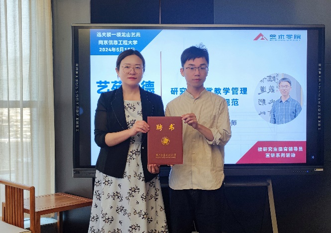 活动伊始,詹筱茹给景滋本颁发了校聘德育辅导员聘书,她指出,自我校2020年出台《南京信息工程大学研究生德育辅导员实施办法》以来,365英国上市公司党委精心选育,推荐政治素养高、育人水平强、责任意识足、作风严谨、师德师风优良的同志担任校聘研究生德育辅导员。