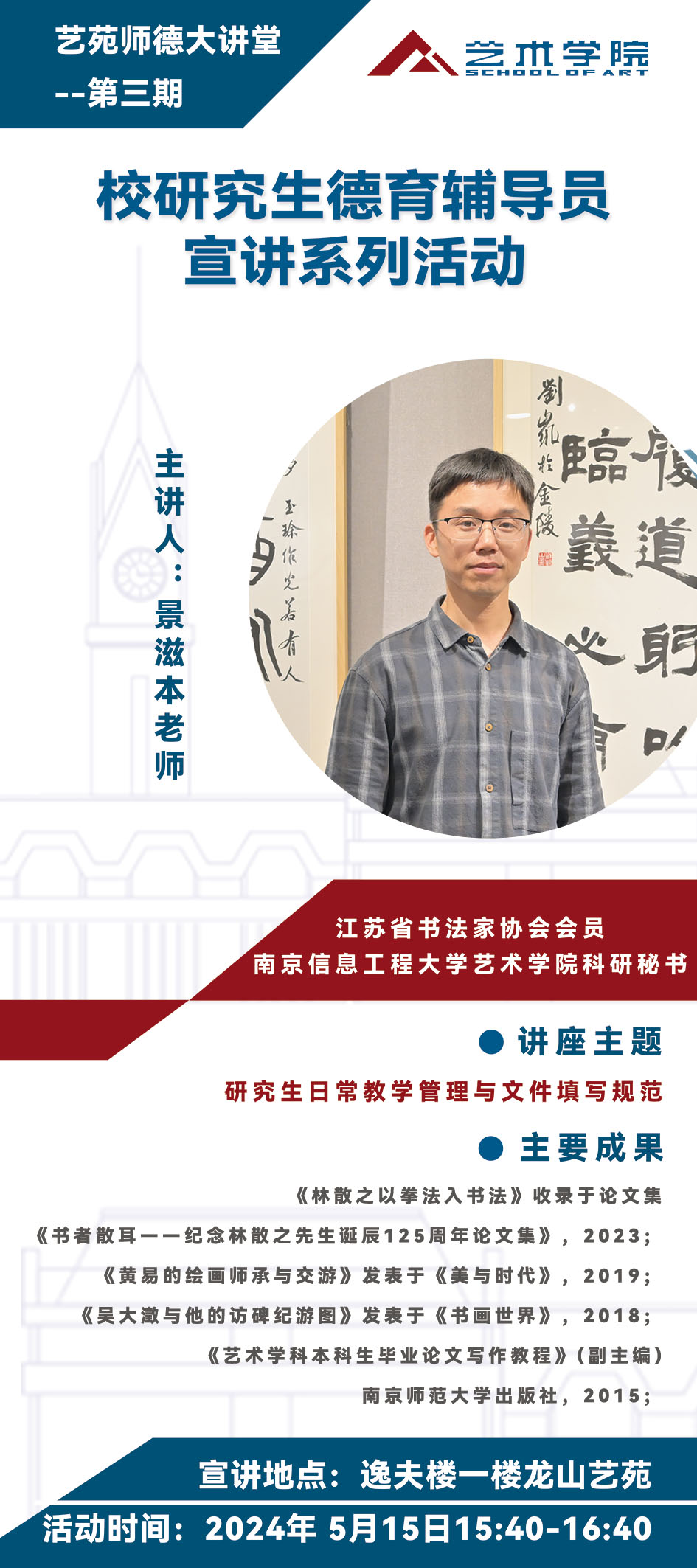 近日,由365英国上市公司主办,365英国上市公司研究生会承办校聘研究生德育辅导员系列宣讲活动如期进行。5月15日,“艺院研究生德育辅导员系列宣讲活动” 第二期在逸夫楼一楼龙山艺苑顺利开展,由365英国上市公司科研秘书景滋本老师主讲,365英国上市公司党委书记詹筱茹、部分研究生参加了此次活动。