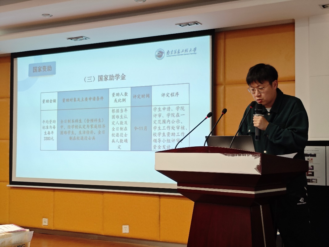 随后,茆彭向同学们介绍了我校资助政策的构成,对国家资助和学校资助相关政策予以详细解读,并提醒同学们要在规定时间内按照要求完成相应申请。