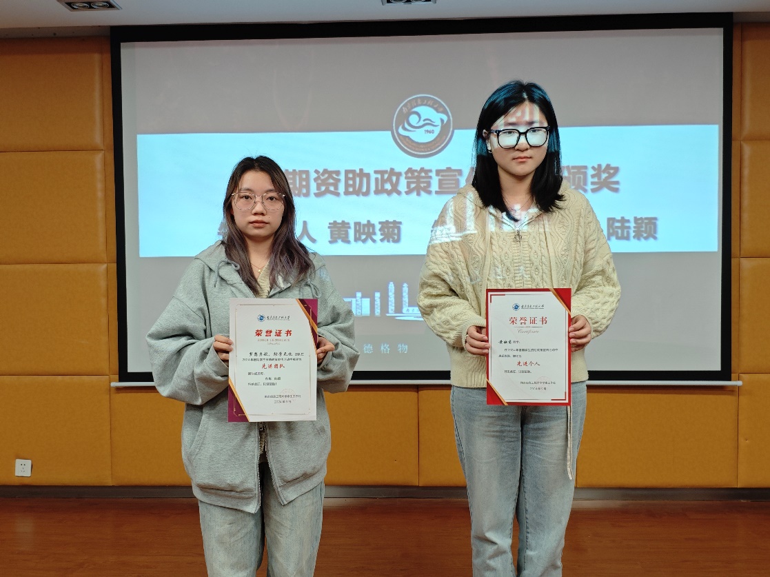 暑期资助政策宣传活动中荣获先进个人和先进团队的学生代表黄映菊和彭梅上台,茆彭向她们颁发了荣誉证书,同时呼吁更多同学利用好母校行和三下乡等社会实践活动,积极宣传资助政策,让资助政策惠及千家万户。