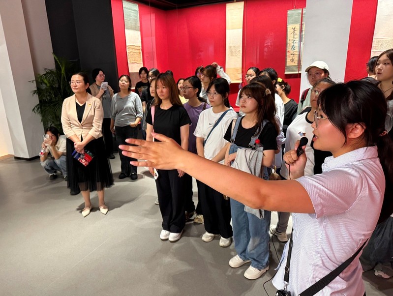 参观伊始,詹筱茹主讲“习近平总书记关于文艺工作的重要论述”微党课,她指出:党的十八大以来,习近平总书记先后主持召开文艺工作座谈会,出席中国文联、中国作协全国代表大会开幕式,致信文艺工作者,多次就文艺工作发表重要讲话、作出重要指示批示,是推进新时代中国特色社会主义文艺发展的行动指南,是建设社会主义文化强国的根本遵循。她号召青年学生要始终坚守“以人民为中心”的创作导向,紧密围绕中国优秀传统文化,创作出更多精品,“让收藏在博物馆里的文物、陈列在广阔大地上的遗产、书写在古籍里的文字都活起来”。