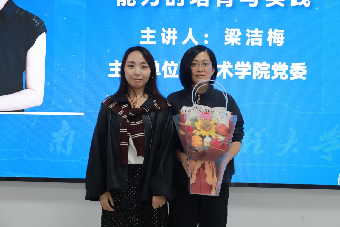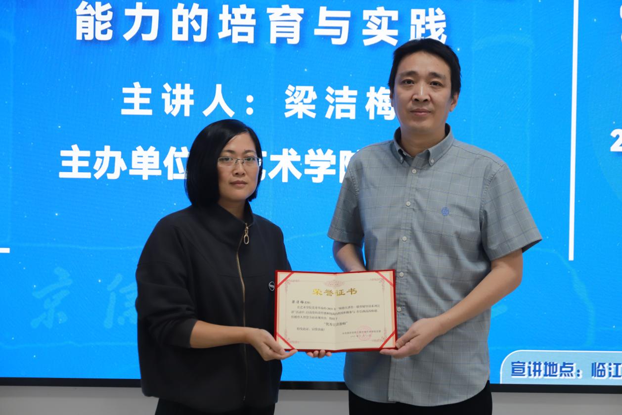 李纯成对梁洁梅给予了高度认可,并颁发“优秀宣讲教师”荣誉证书,同时学生代表进行献花,对宣讲教师表示诚挚感谢。